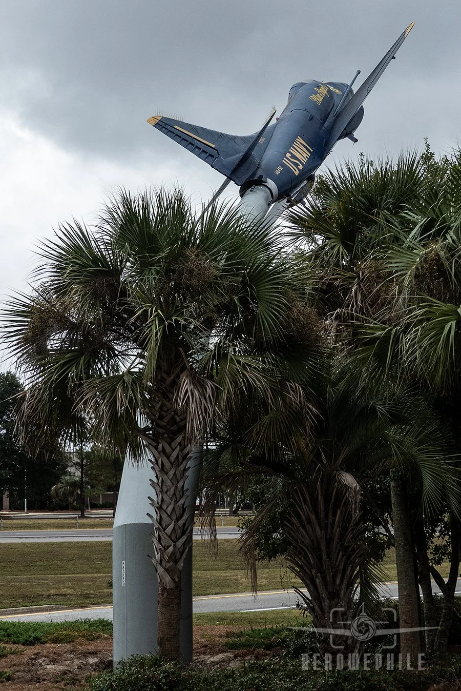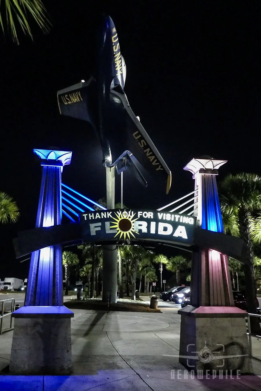 Making a trip down Florida Interstate 10 to Mobile, Alabama to visit the battleship USS Alabama, I was surprised to discover a Douglas A-4L Skyhawk painted in a Blue Angels livery on a pole at a rest stop near Pensacola, Florida (Home of the World Famous Blue Angels Flight Demonstration Team). After a quick turnaround, I stopped to get some photos of this fantastic looking Blue Angel.