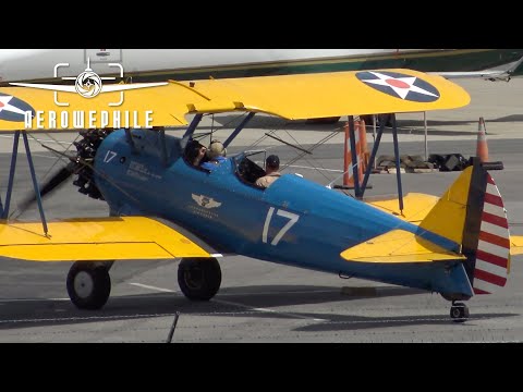 Boeing PT-13 Stearman Biplane Arrival - Takeoff - Landing - Shutdown